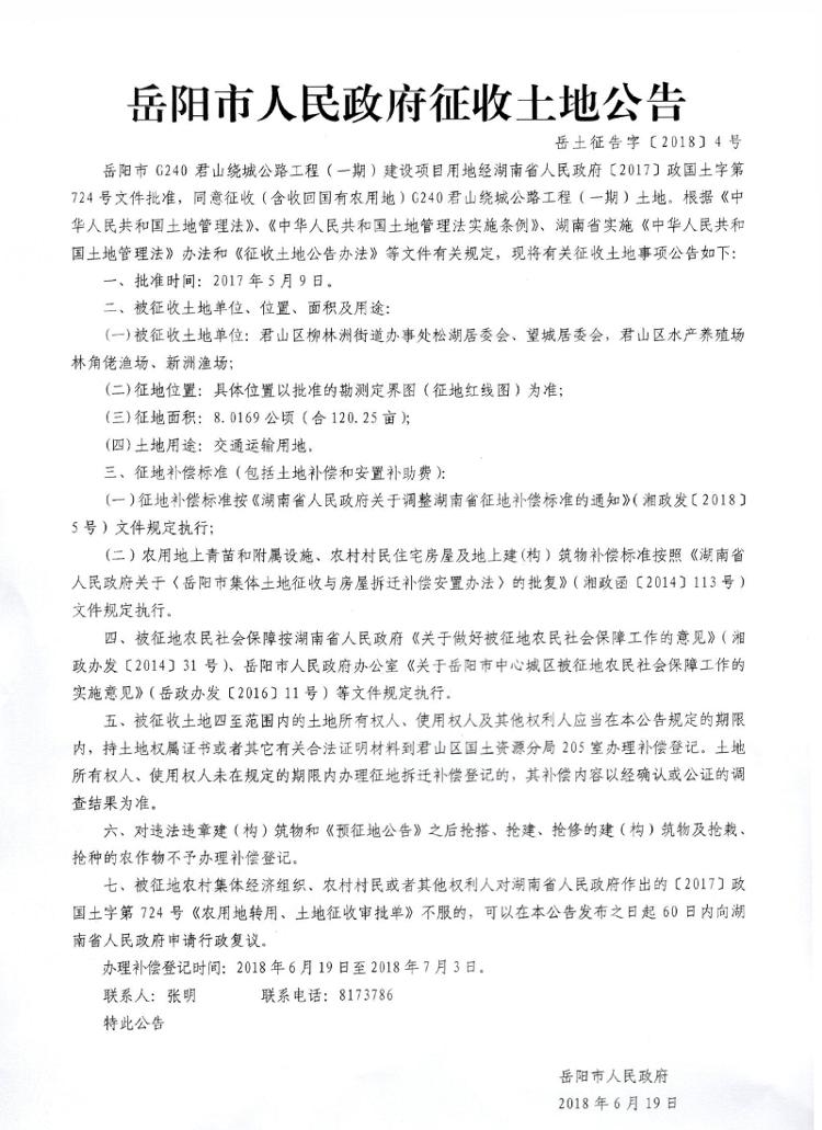 岳阳市G240君山绕城公路工程(一期)建设项目征收土地公告 岳土征告字〔2018〕4号