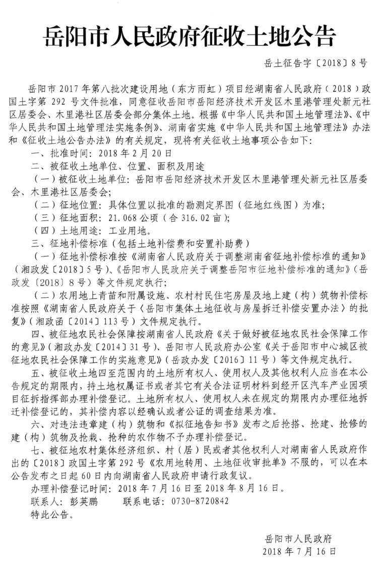 岳阳市2017年第八批次(东方雨虹)建设项目征收土地公告〔2018〕8号