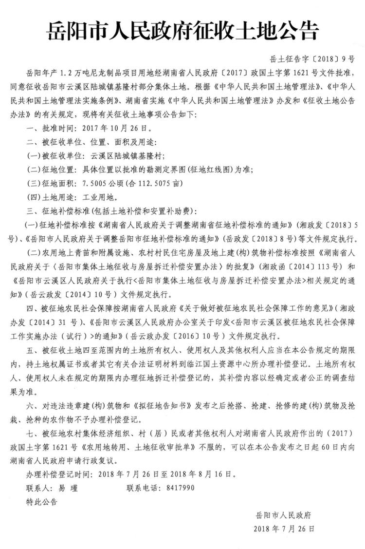 岳阳年产1.2万吨尼龙制品项目征收土地公告〔2018〕9号