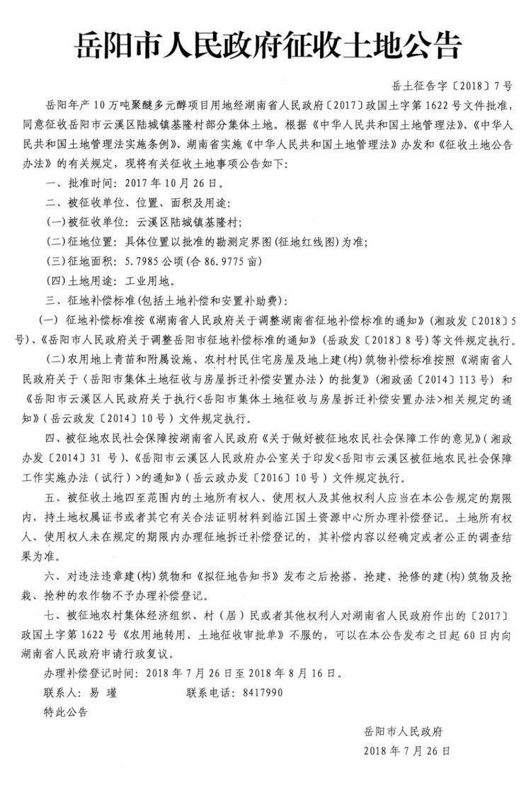 岳阳年产10万吨聚醚多元醇生产项目征收土地公告〔2018〕7号