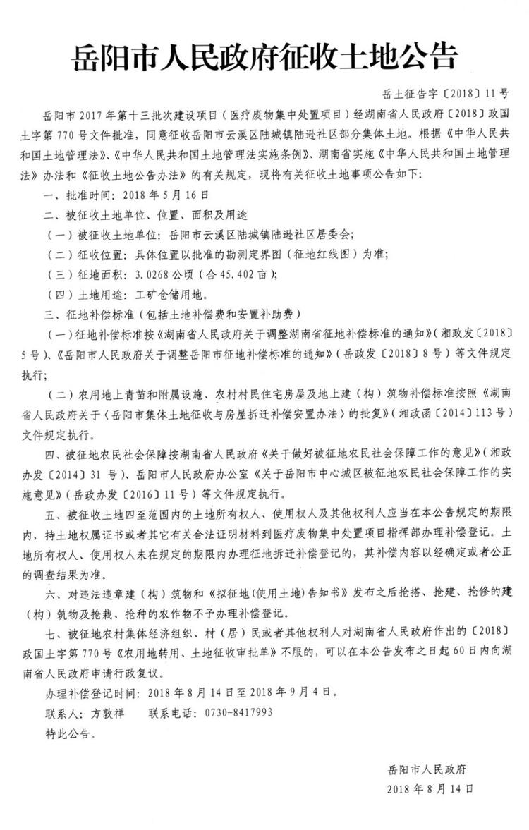 岳阳市2017年第十三批次建设项目(医疗废物集中处置项目)征收土地公告〔2018〕11