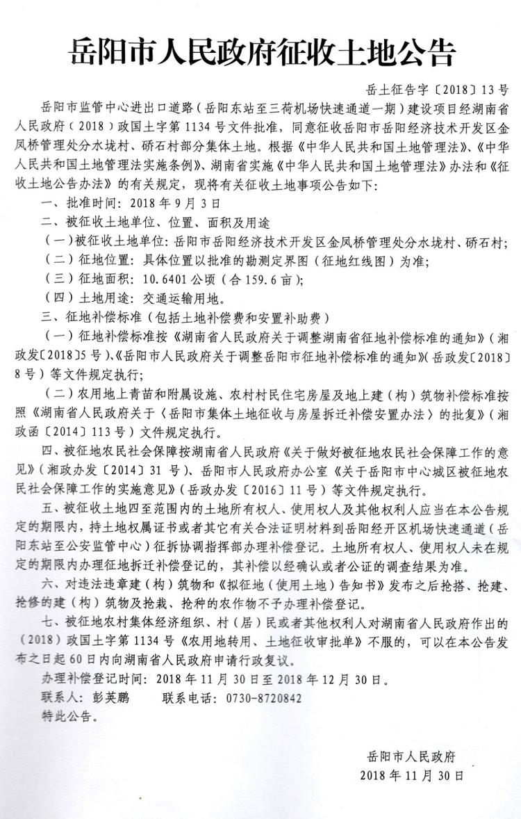 岳阳市监管中心进出口道路(岳阳东站至三荷机场快速通道一期)征收土地公告〔2018〕13号