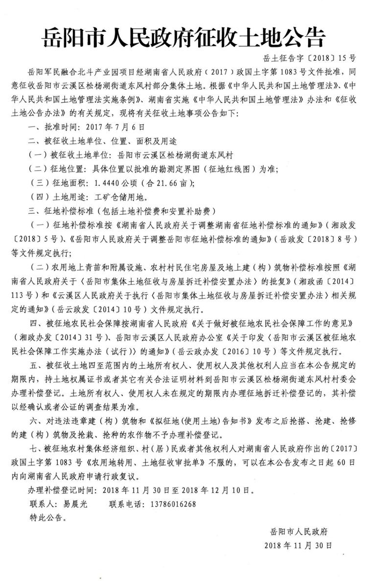岳阳军民融合北斗产业园项目征收土地公告岳土征告字〔2018〕15号