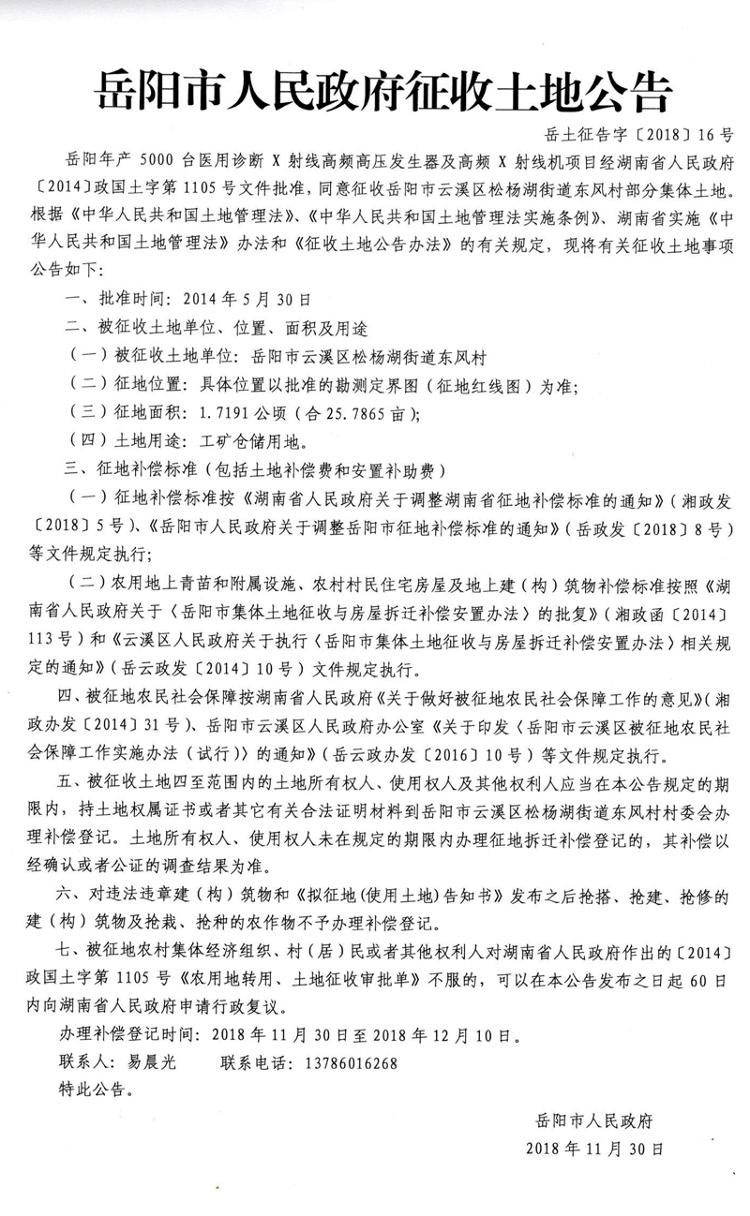 岳阳年产5000台医用诊断X射线高频高压发生器及高频X射线机项目征收土地公告岳土征告字〔2018〕16号