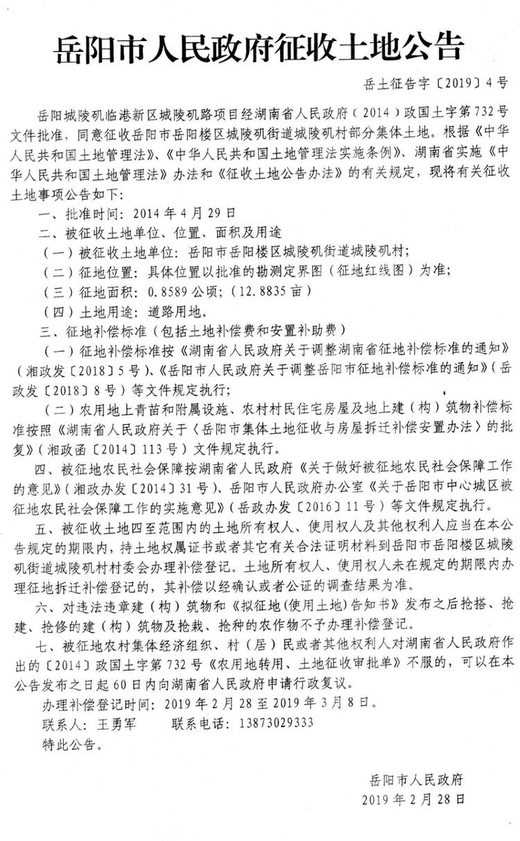 岳阳城陵矶临港新区城陵矶路项目征收土地公告〔2019〕4号