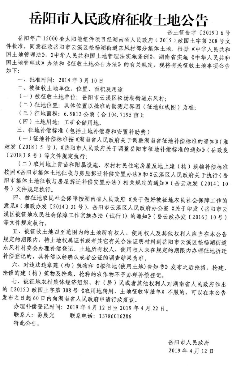 岳阳年产15000套太阳能组件项目征收土地公告〔2019〕6号