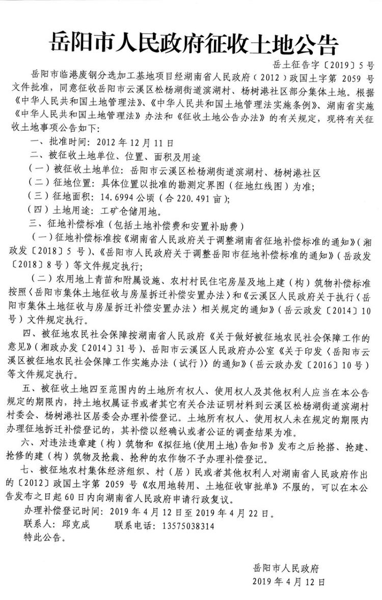 岳阳市临港废钢分选加工基地项目征收土地公告〔2019〕5号
