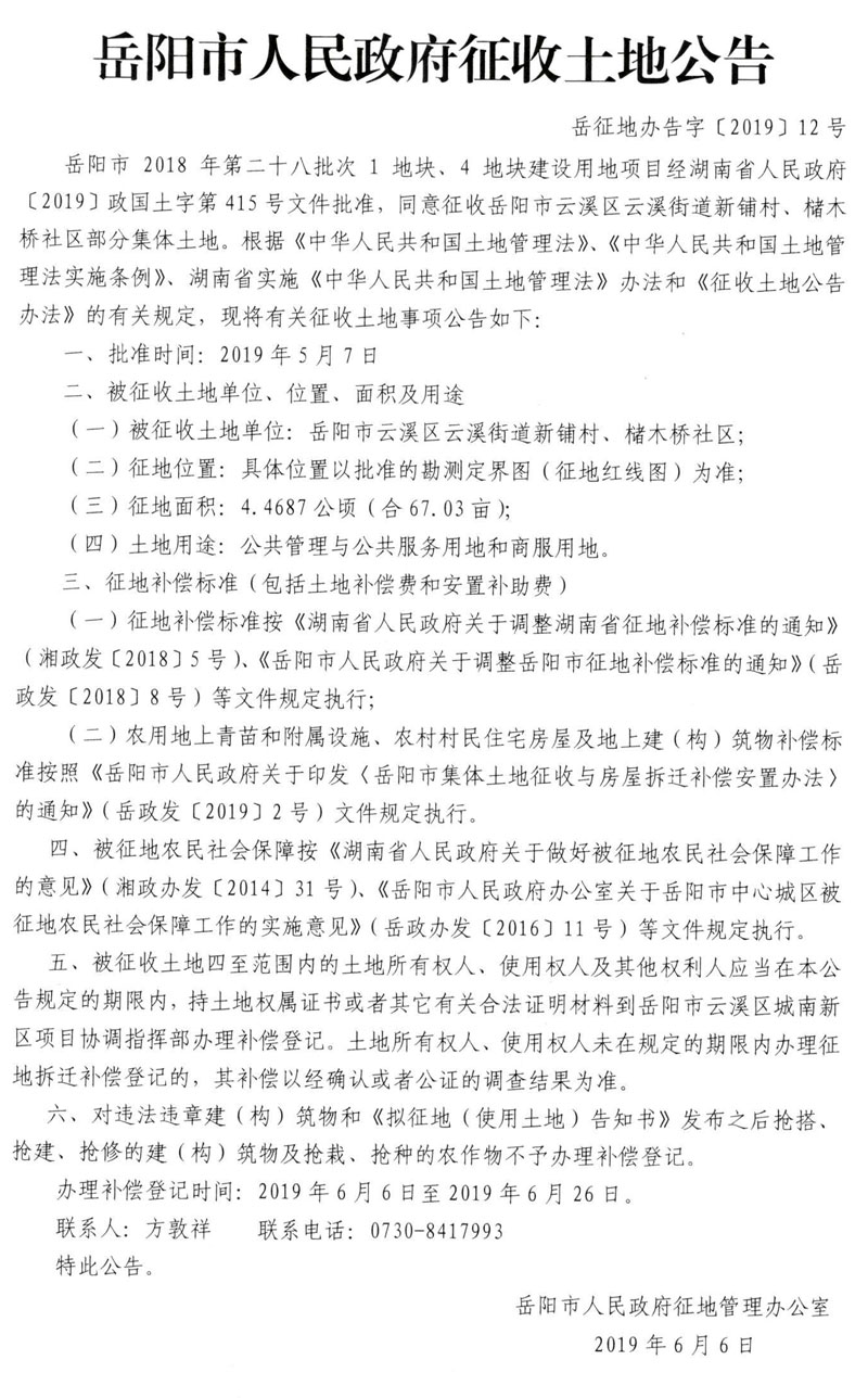 岳阳市2018年第二十八批次1地块、4地块建设用地项目征收土地公告〔2019〕12号