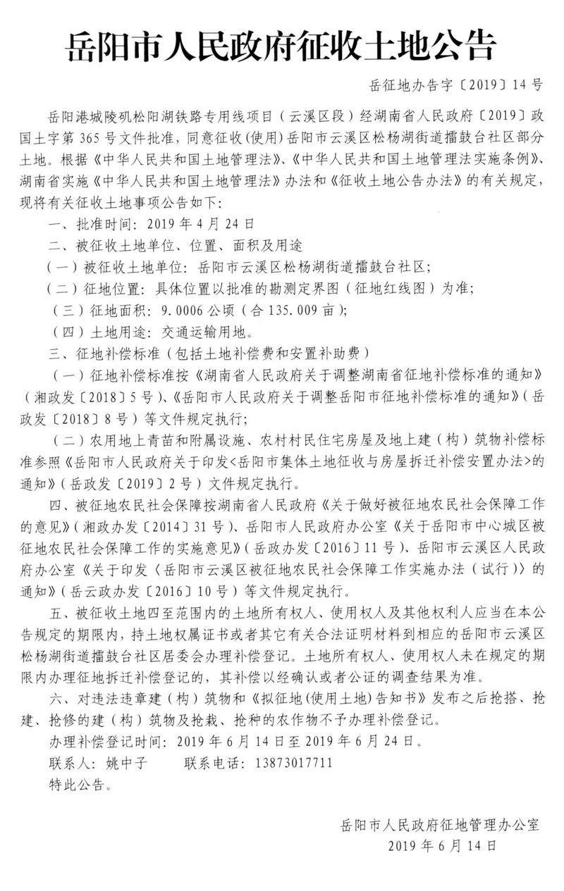 岳阳港城陵矶松阳湖铁路专用线项目(云溪段)征收土地公告〔2019〕14号