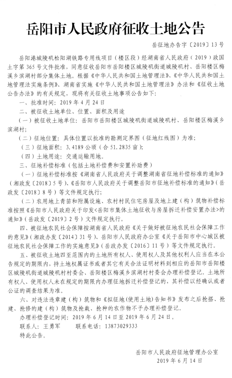 岳阳港城陵矶松阳湖铁路专用线项目(楼区段)征收土地公告〔2019〕13号