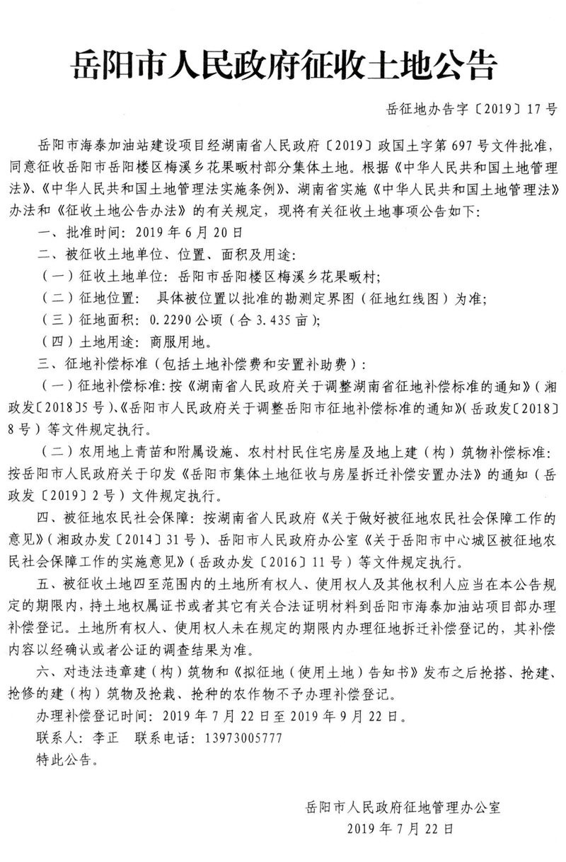 岳阳市海泰加油站建设项目征收土地公告〔2019〕17号