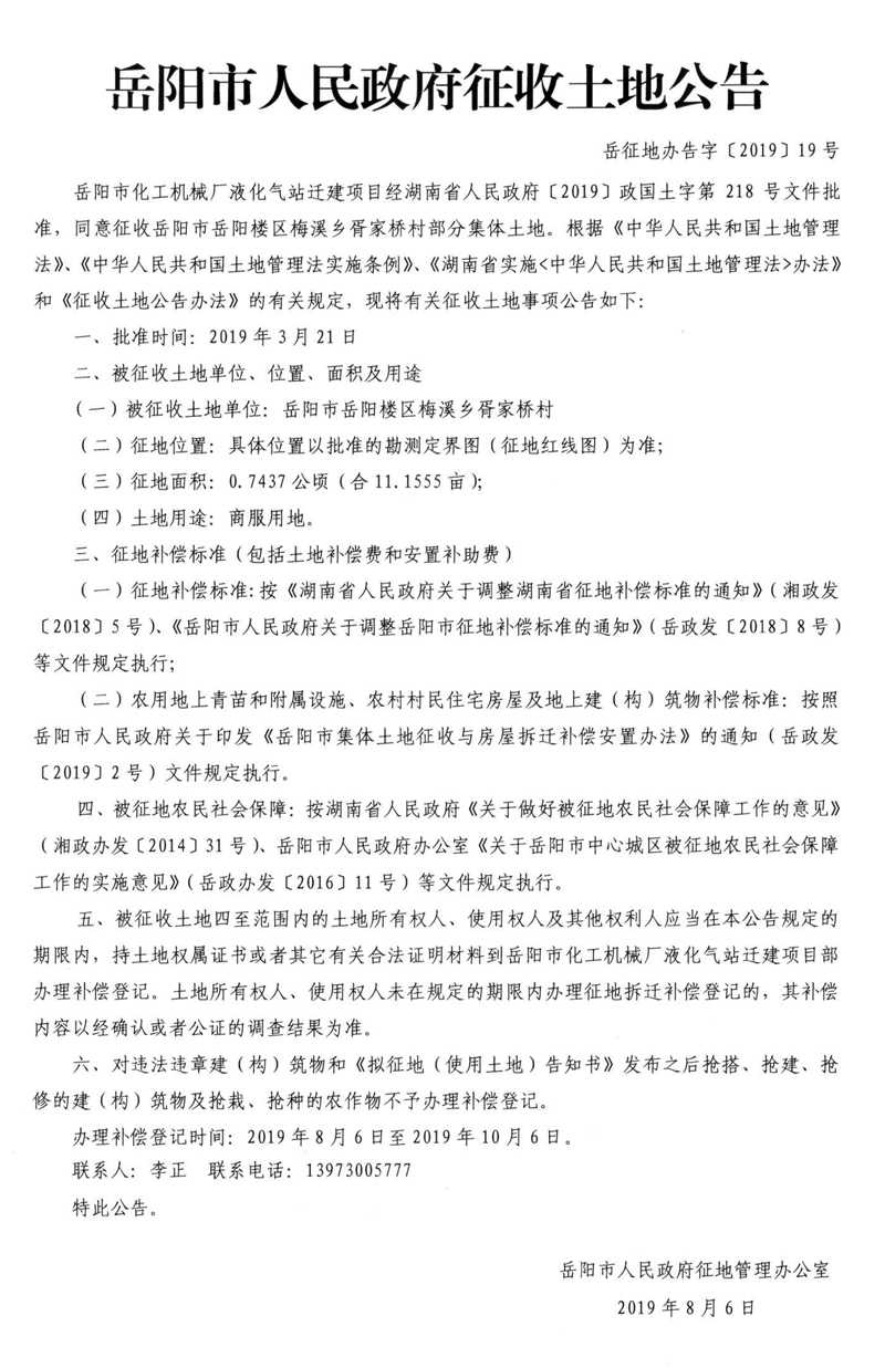 岳阳市化工机械厂液化气站迁建项目征收土地公告〔2019〕19号