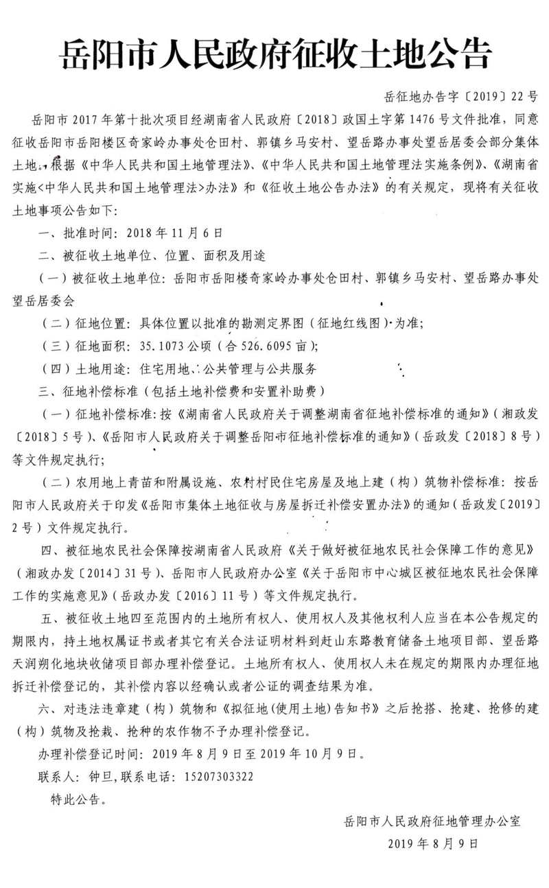 岳阳市2017年第十批次建设用地征收土地公告〔2019〕22号