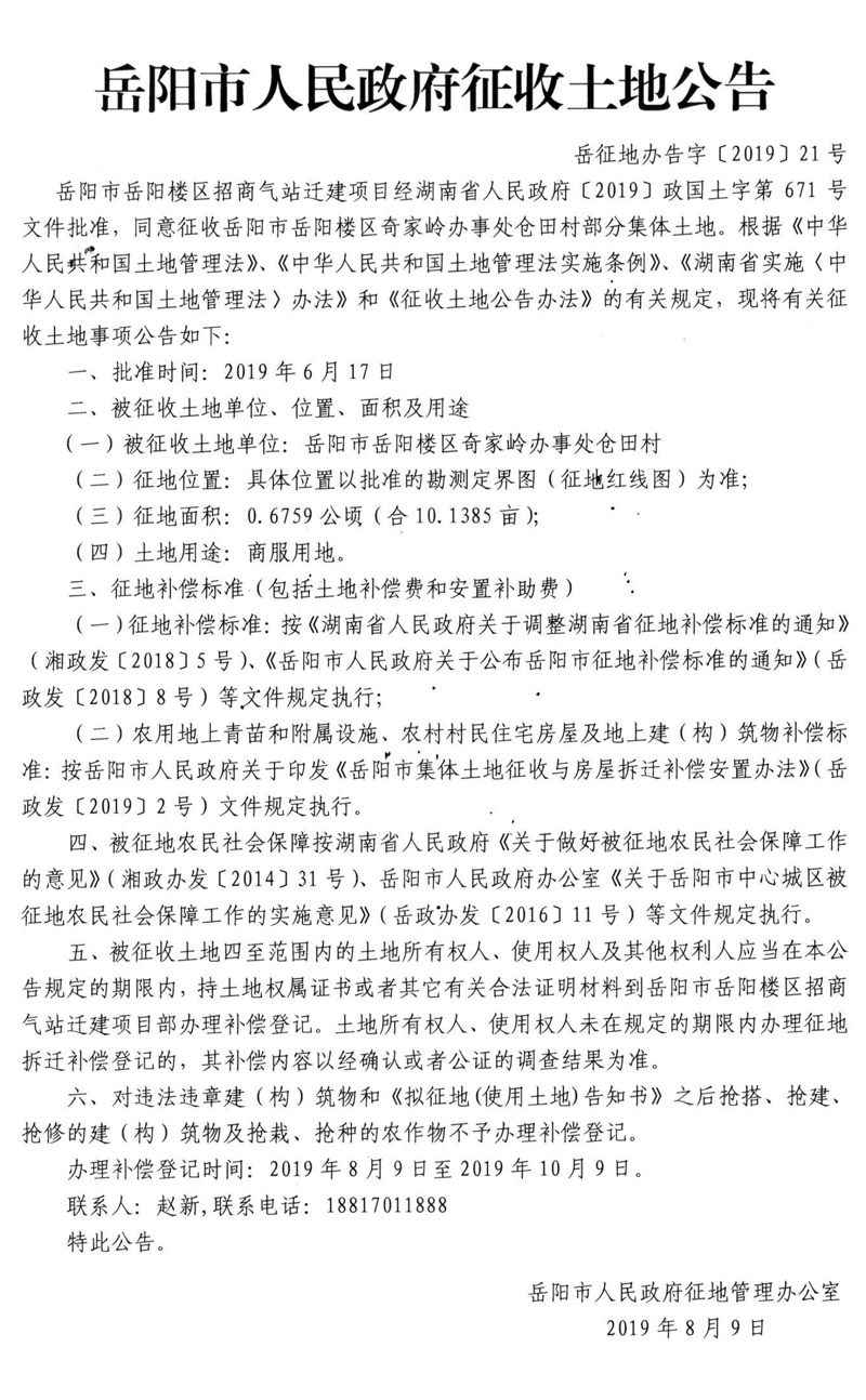 岳阳市岳阳楼区招商气站迁建项目征收土地公告〔2019〕21号