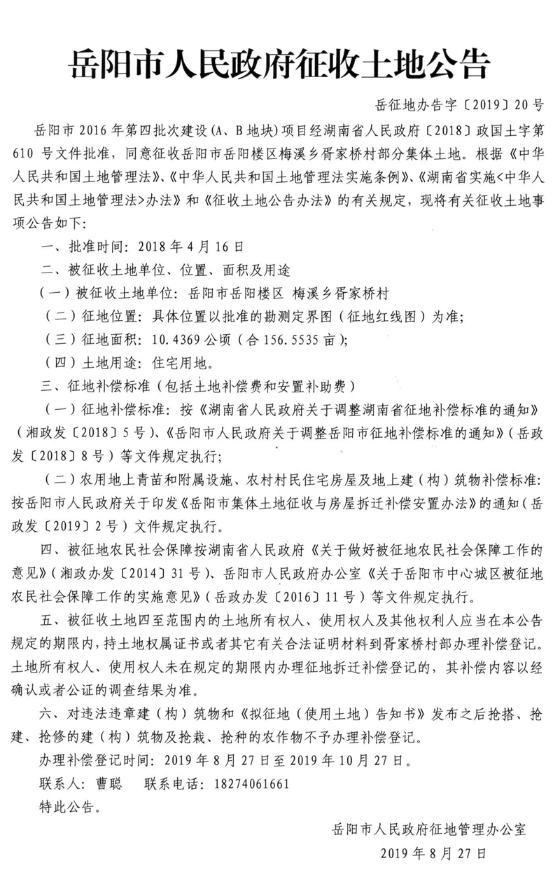 岳阳市2016年第四批次建设(A、B地块)项目征收土地公告〔2019〕20号