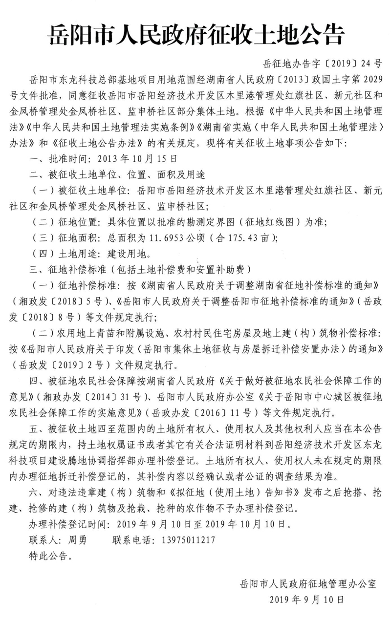 岳阳市东龙科技总部基地项目征收土地公告〔2019〕24号
