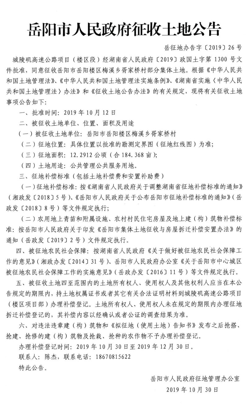 城陵矶高速公路项目(楼区段)征收土地公告〔2019〕26号