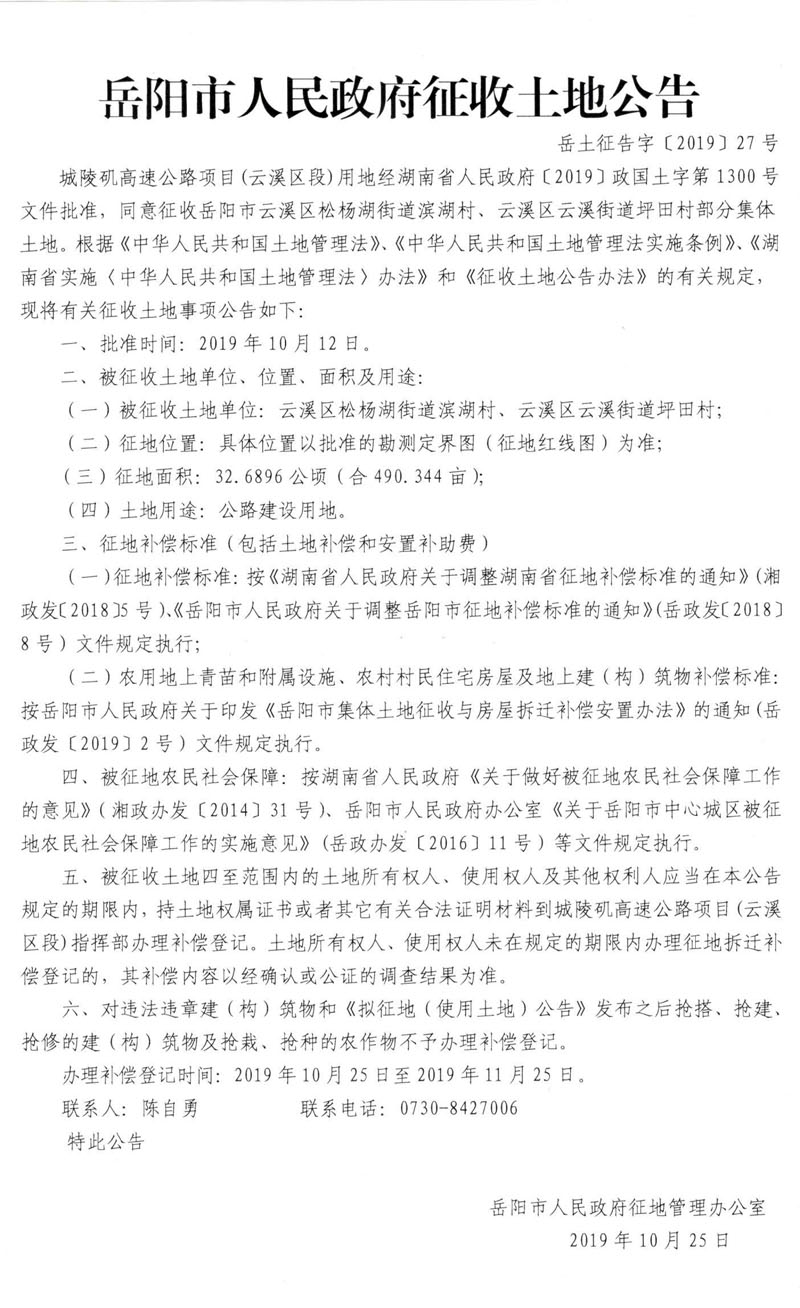 城陵矶高速公路项目(云溪区段)征收土地公告〔2019〕27号