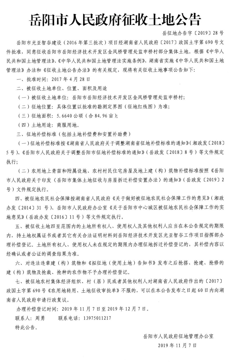 岳阳市光亚智谷建设(2016年第三批次)项目征收土地公告〔2019〕28号