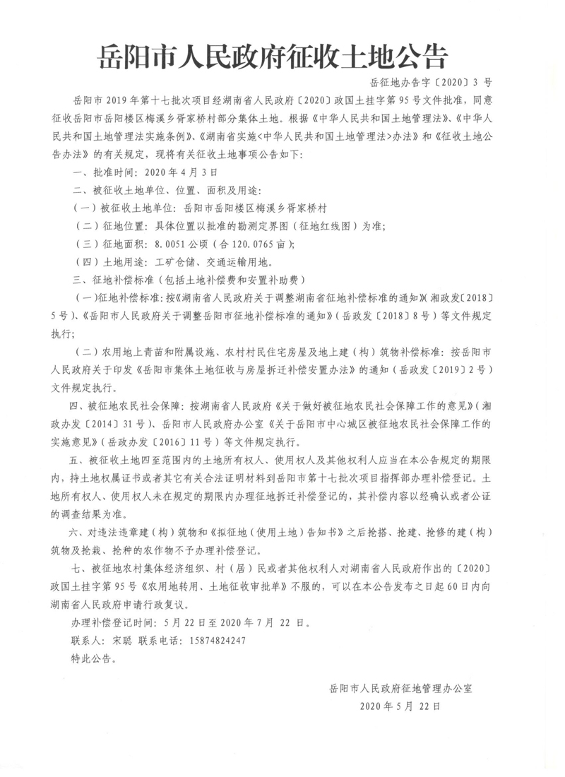 岳阳市2019第十七批次征收土地公告(岳征地办告字[2020]3号)