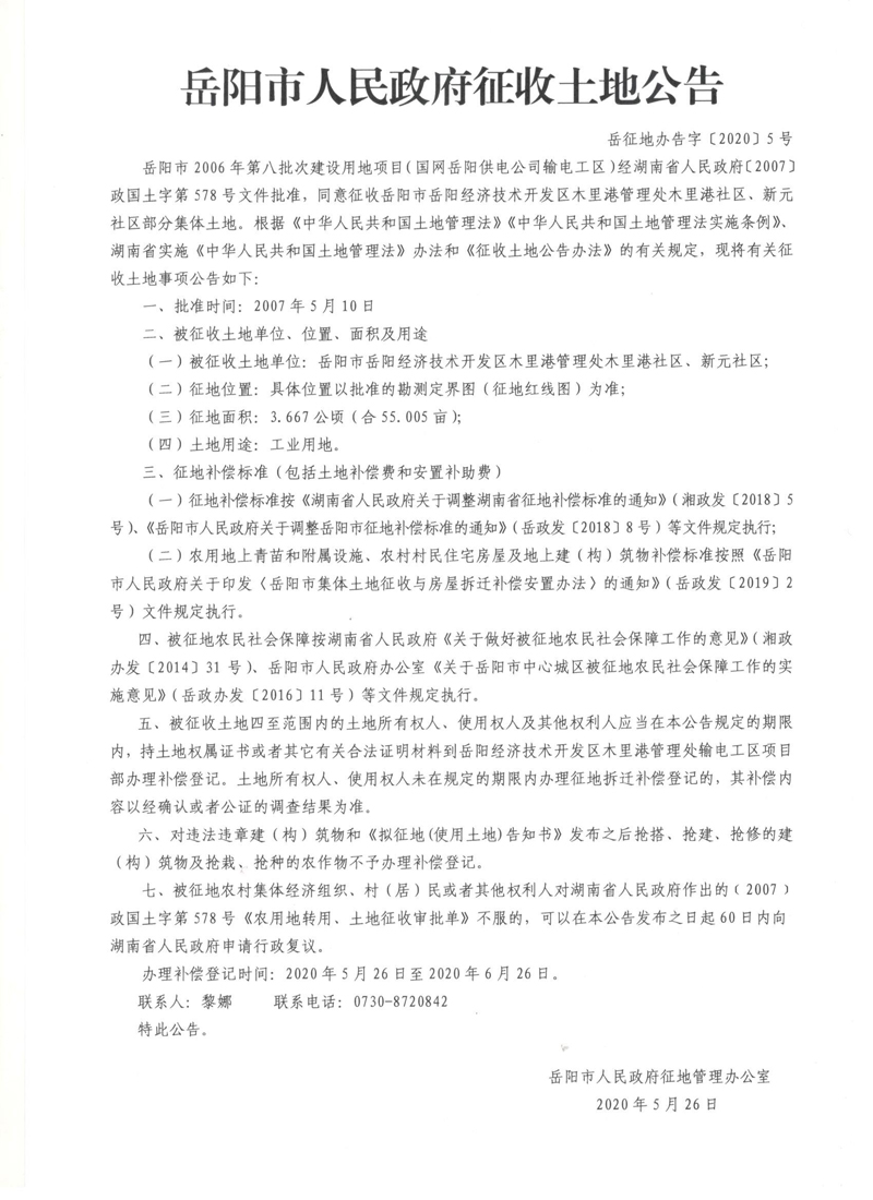 岳阳市2006年第八批次建设用地项目(国网岳阳供电公司输电工区)征收土地公告、岳征地办告字(2020)5号
