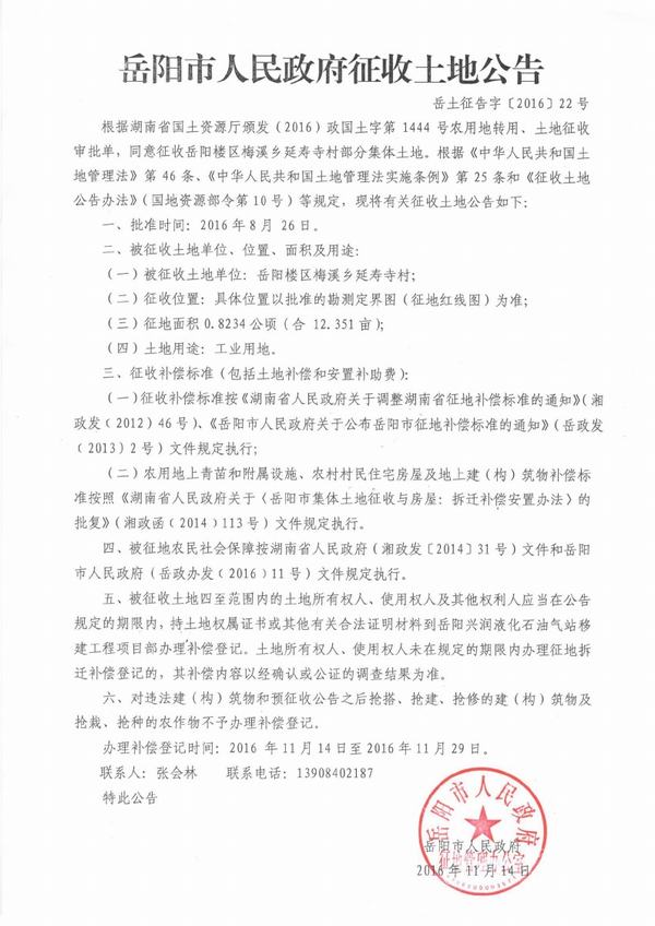 岳阳市人民政府征收土地公告|岳土征告字〔2016〕22号
