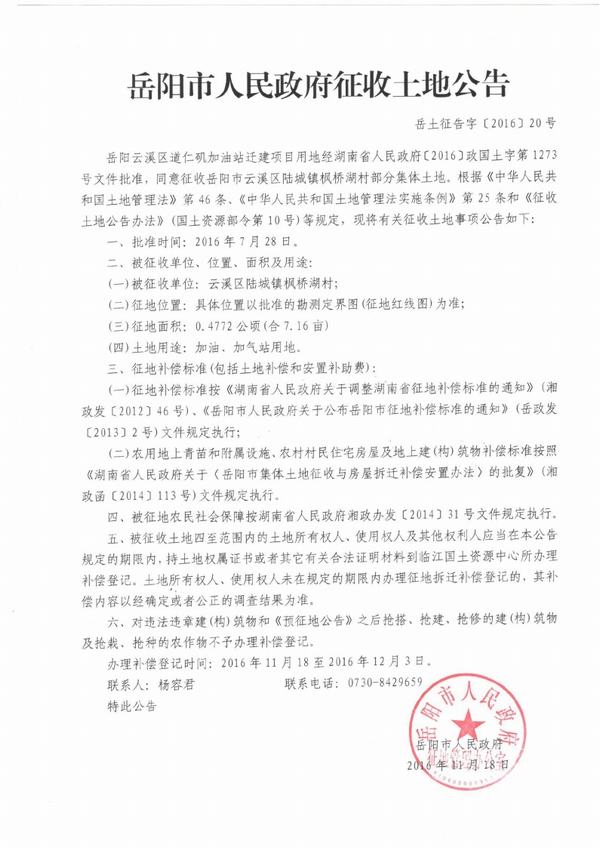 岳阳市人民政府征收土地公告|岳土征告字〔2016〕20号