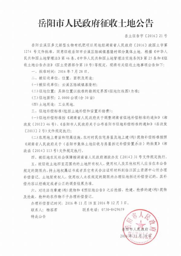岳阳市人民政府征收土地公告|岳土征告字〔2016〕21号