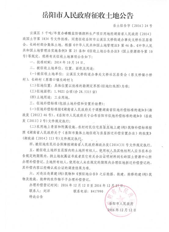 岳阳市人民政府征收土地公告|岳土征告字〔2016〕24号