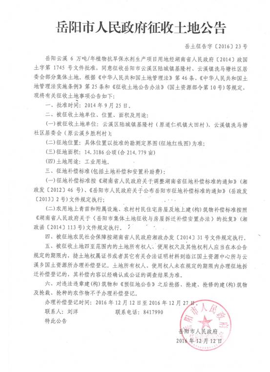 岳阳市人民政府征收土地公告|岳土征告字〔2016〕23号