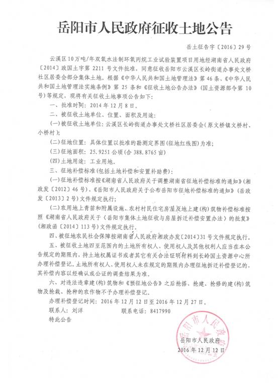 岳阳市人民政府征收土地公告|岳土征告字〔2016〕29号