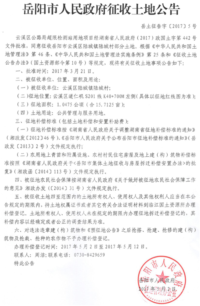 云溪区公路局超限检测站征收土地公告(2017.5号)