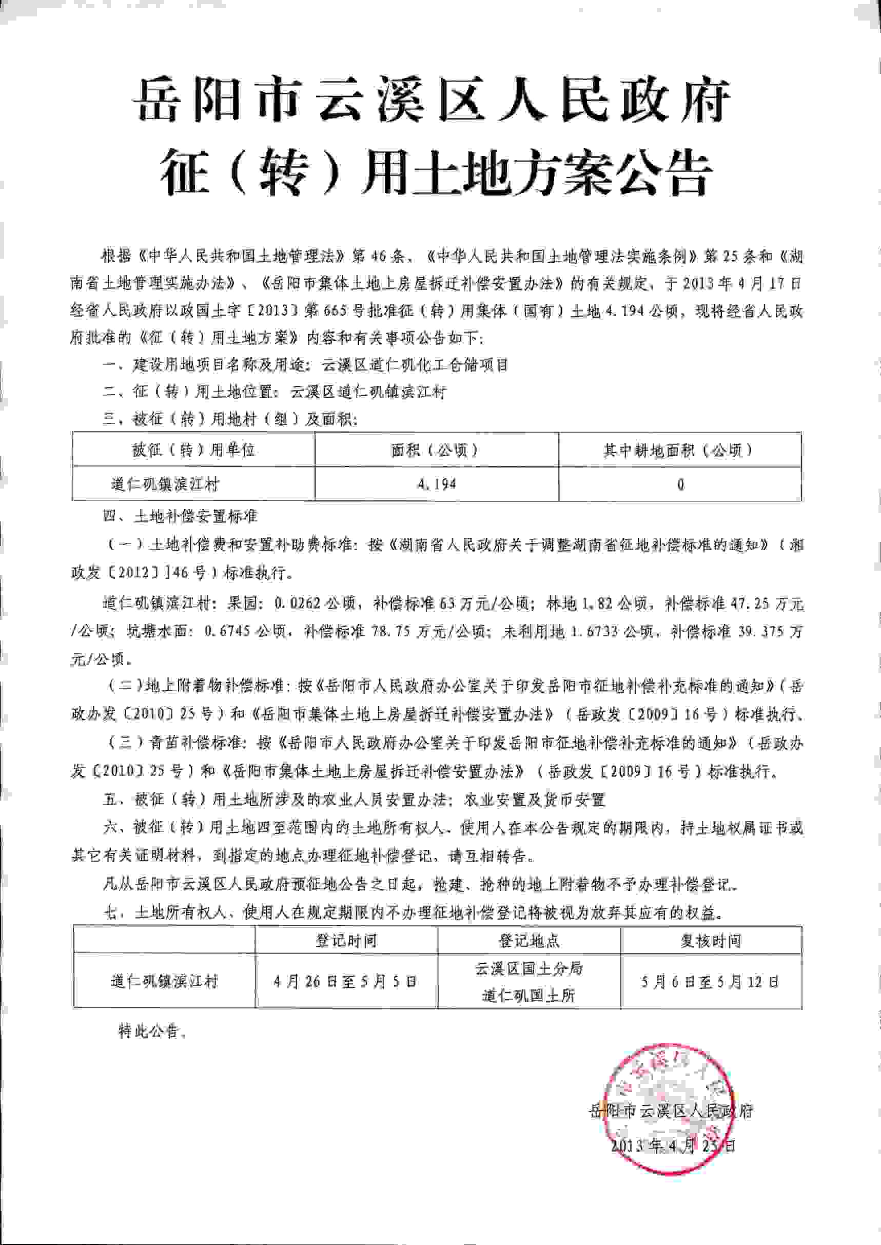 岳阳市云溪区人民政府征(转)用土地方案公告|云溪区道仁矶化工仓储项目