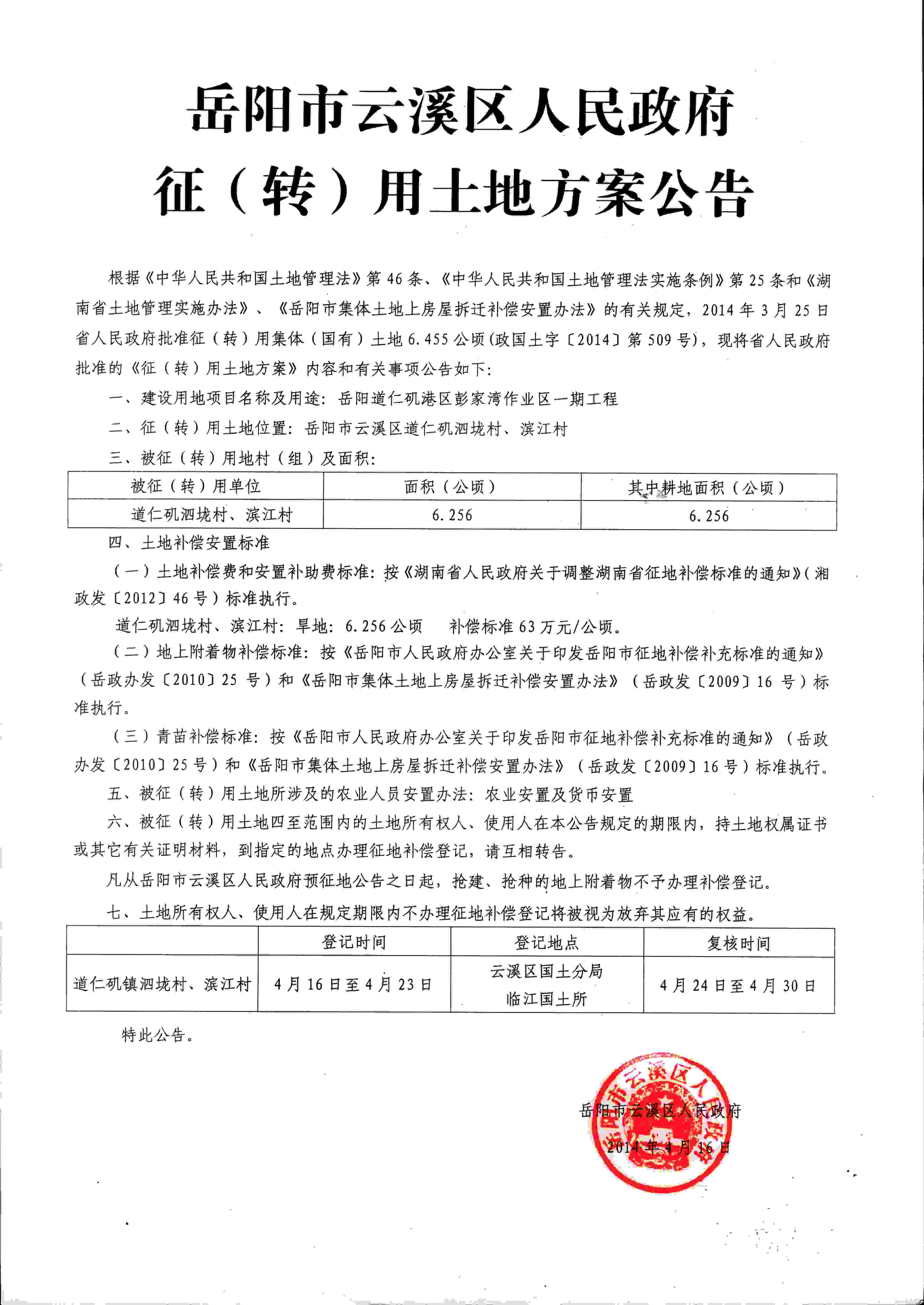 岳阳市云溪区人民政府征(转)用土地方案公告|岳阳道仁矶港区彭家湾作业区一期工程