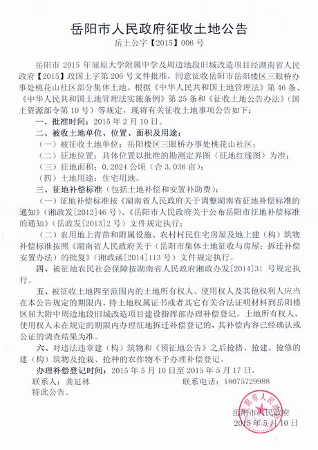 岳阳市人民政府征地管理办公室征收土地公告|岳土公字[2015]06号