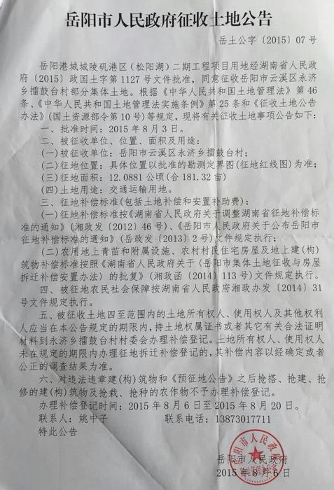 岳阳市人民政府征收土地公告|岳土公字〔2015〕07号