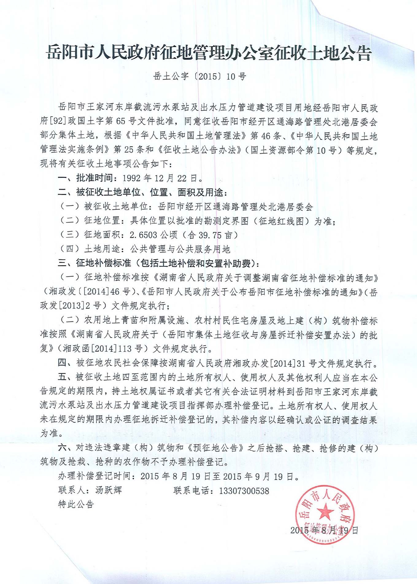 岳阳市人民政府征地管理办公室征收土地公告|岳土公字[2015]10号