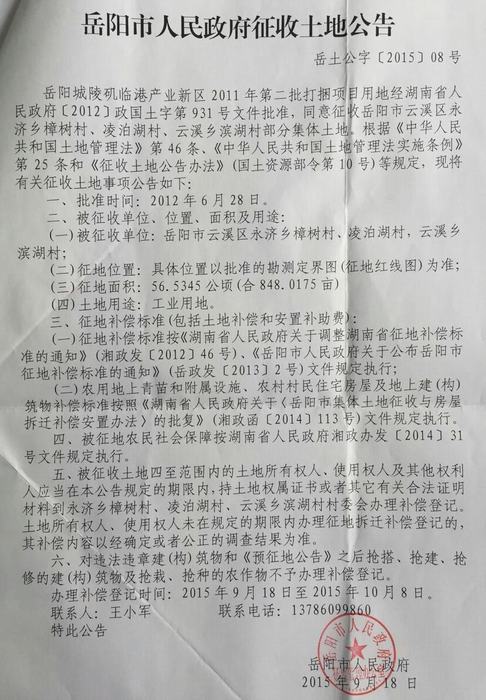 岳阳市人民政府征收土地公告|岳土公字〔2015〕08号