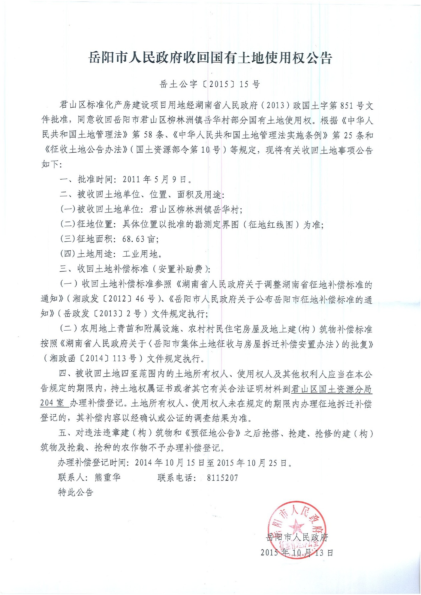 岳阳市人民政府收回国有土地使用权公告|岳土公字[2015]15号