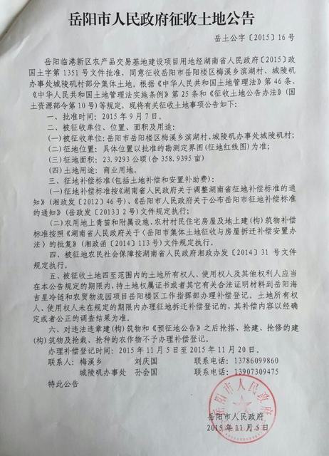 岳阳人民政府征收土地公告|岳土公字〔2015〕16号