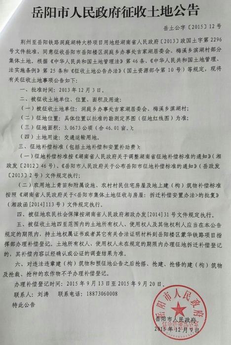 岳阳人民政府征收土地公告|岳土公字〔2015〕12号