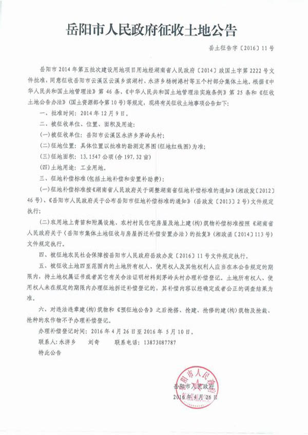 岳阳市人民政府征收土地公告|岳土征告字〔2016〕11号
