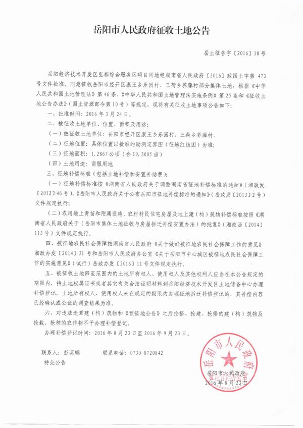 岳阳市人民政府征收土地公告|岳土征告字〔2016〕18号