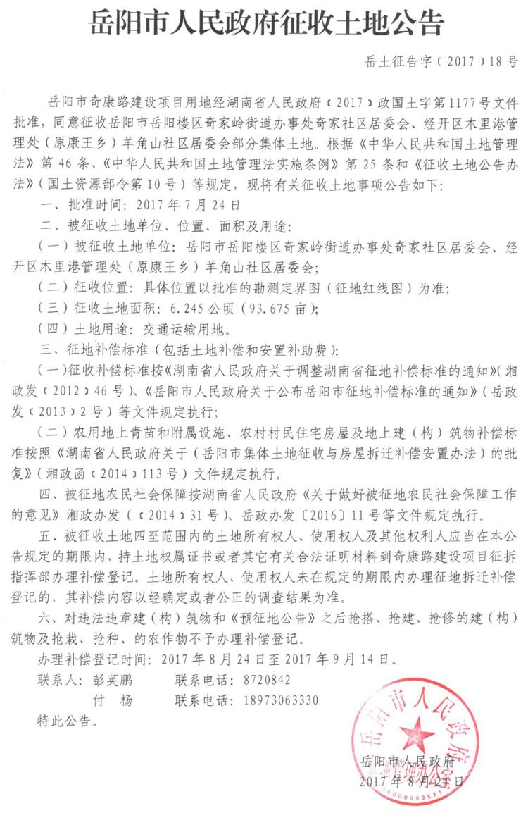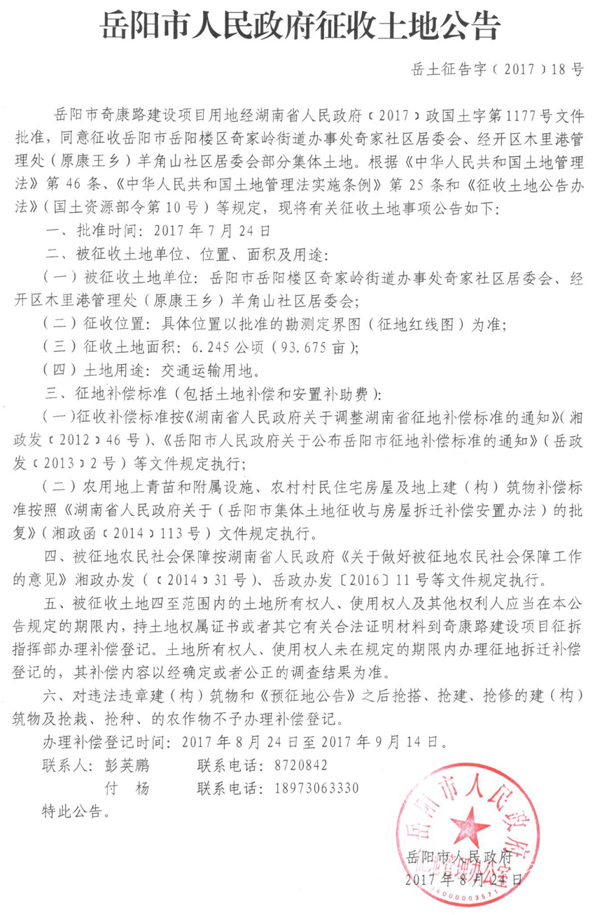 岳阳市奇康路建设项目市政府征地公告(2017)18号