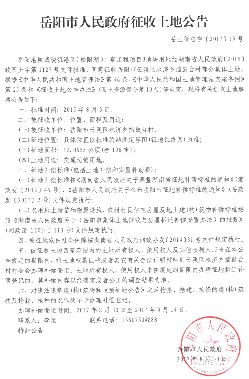岳阳港城城陵矶港区(松阳湖)二期工程项目B地块征收土地公告(2017)19号