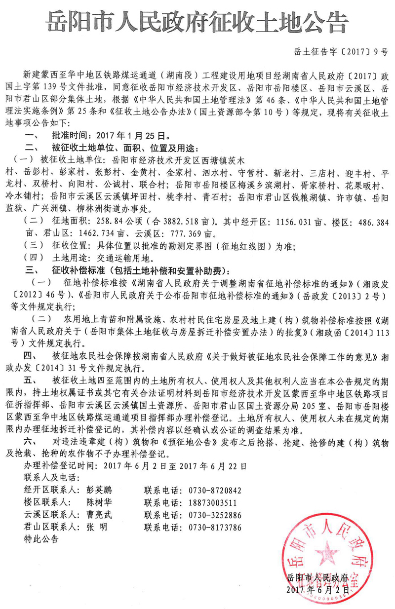 蒙西至华中地区铁路煤运通道项目征收土地公告(2017)9号