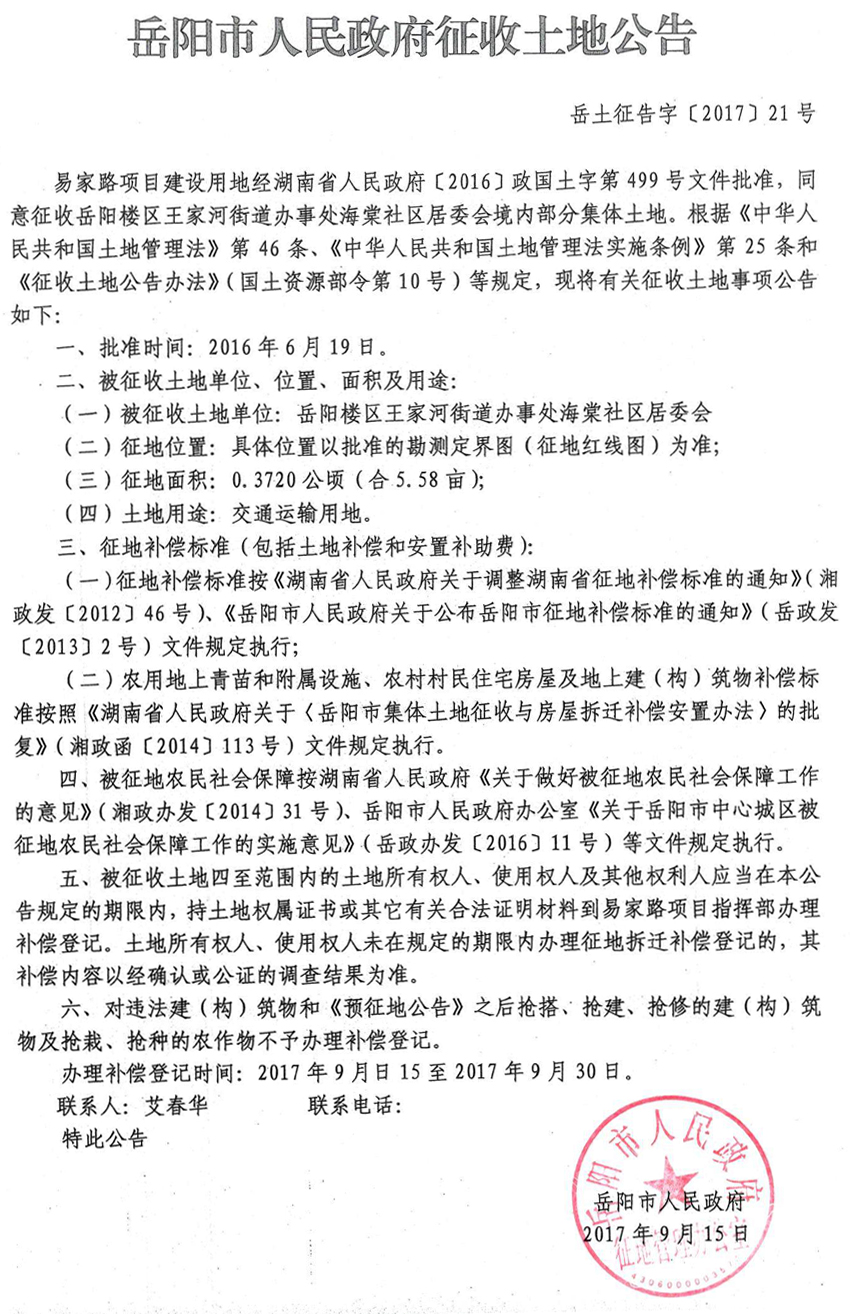 易家路项目征收土地公告(2017)21号