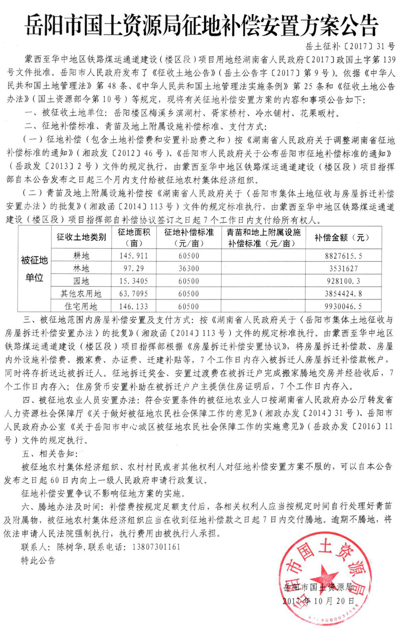 蒙西至华中地区铁路煤运通道(楼区段)征地补偿安置方案公告(2017)31号