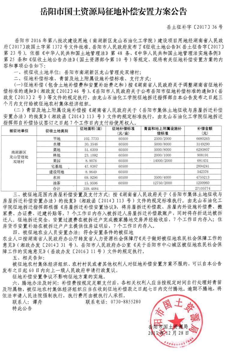 岳阳市2016年第八批次建设用地〔南湖新区龙山石油化工学院〕项目征地补偿安置方案公告〔2017〕36号