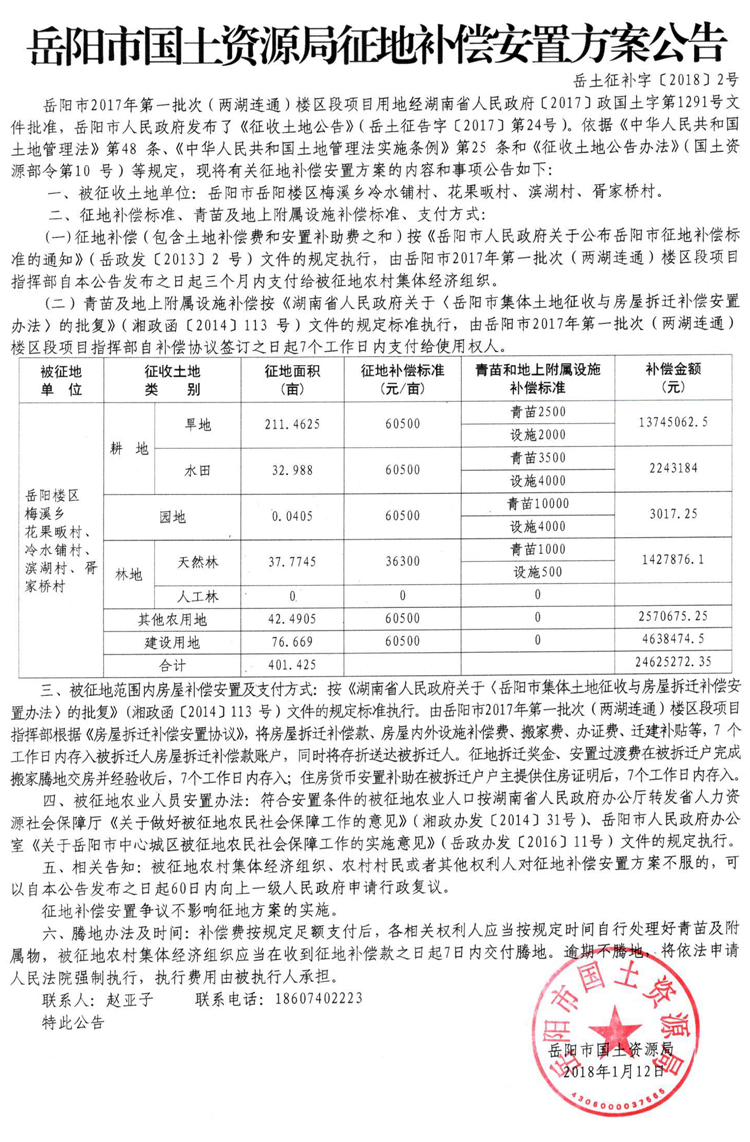 岳阳市2017 年第一批次(两湖连通)楼区段项目征地补偿安置方案公告〔2018〕2号